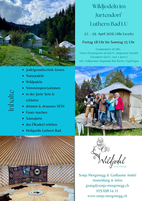 Wir lernen über handfeste Körperübungen und Stimmtechnik, wie wir unsere Stimme laut und gleichzeitig entspannt einsetzen können. (Arbeit nach Atemtypen und Integrativem Stimmtraining) Wir lernen ein bis zwei mündlich überlieferte Schweizer Naturjüüzli und wir nehmen auch, was aus dem Moment entsteht, lassen uns inspirieren von unserer Umgebung und schöpfen Selbstvertrauen beim genauen Hinhören, grad heben und zauren. Und - nicht zuletzt - widmen wir uns unserer eigenen Wildheit mit Stimme und Körper. Was macht das Jodeln mit mir? Was macht es mit mir in dieser Umgebung?